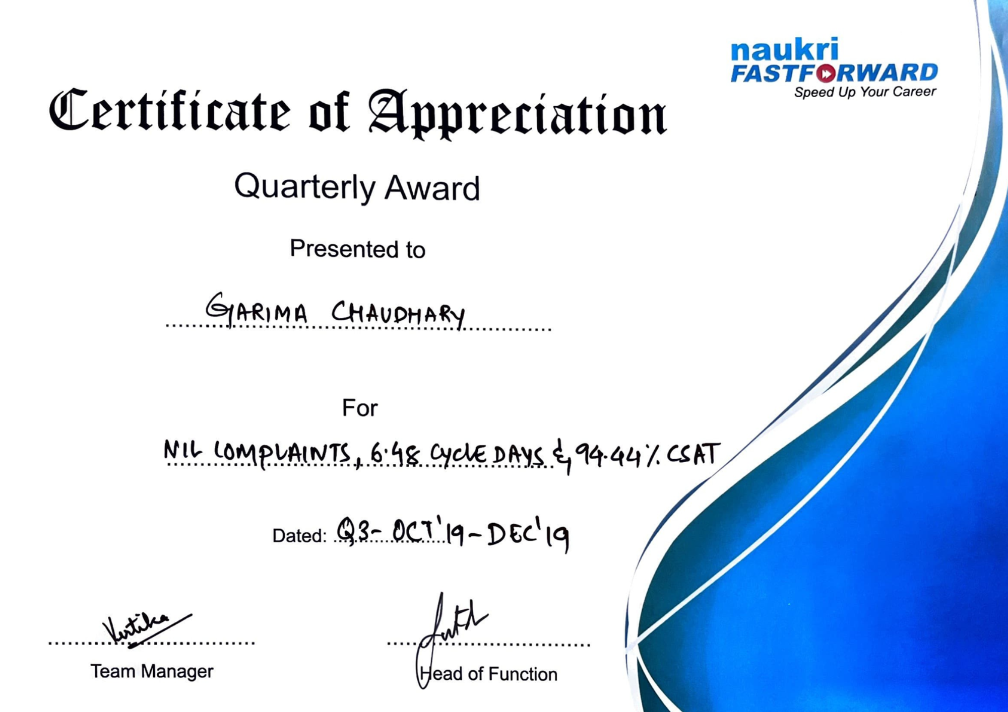 Garima Chaudhary (Founder) is an Award-Winning Resume Writer (Ex- Naukri.com) and received the award for Nil Customer Complaints.